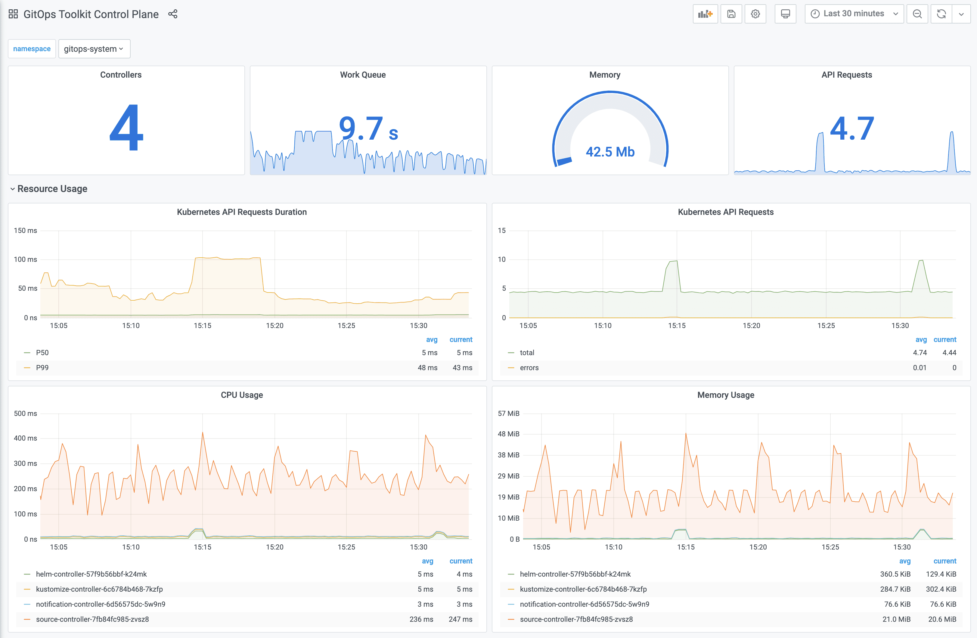 - Grafana dashboards - displays the Flux control plane resource usage and reconciliation stats