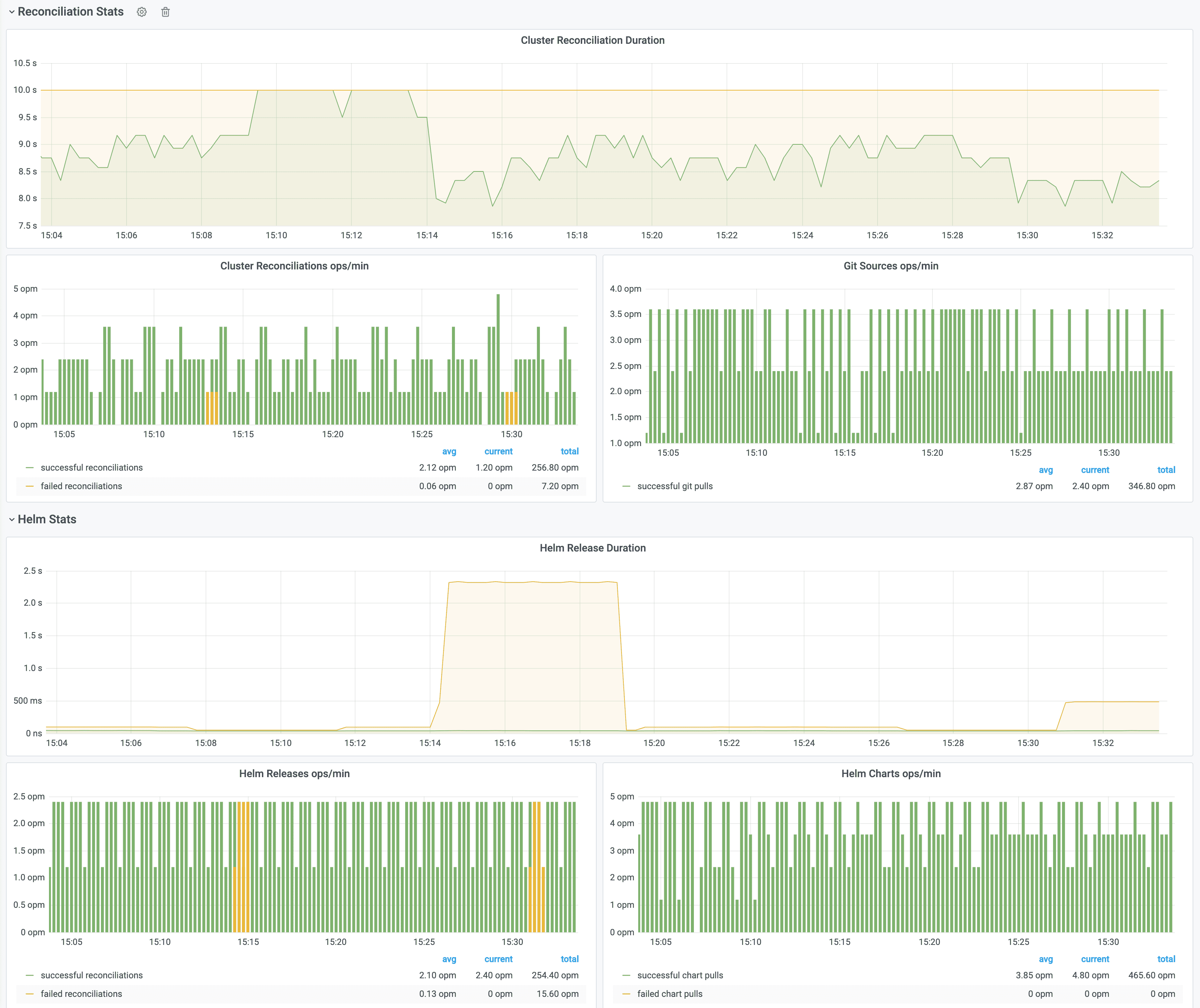 Cluster reconciliation dashboard http://localhost:3000/d/flux-cluster: